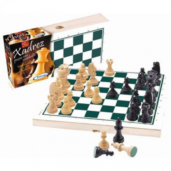 Tabuleiro e Peças em Madeira de Xadrez - XalingoQue tal jogar um xadrez com seus amigos? convide eles e faça boas partidas com ótimas estratégias. Eles irão adorar jogar no tabuleiro de xadrez da xalingo! Fabricado em madeira de altíssima qualidade, durabilidade e resistência contra deformações ou quebras, você pode ter e jogar por muito tempo! Ótimo acabamento e montagem com cores verde e branco altamente vibrantes causando um aspecto de nobreza. Peças confeccionadas em madeira envernizada de maior resistência e beleza com feltro na parte inferior proporcionando melhor deslizamento das peças não riscando o tabuleiro. O xadrez é um jogo de raciocínio onde não existe sorte. Você se diverte, mas quebra a cabeça com estratégias para vencer o seu oponente. O tabuleiro de xadrez da Xalingo é uma boa opção de diversão e desenvolvimento.Informações Técnicas:Medidas: 32 x 6 x 16 cm \'Produto\'Idade Recomendada: Apartir de 7 anos